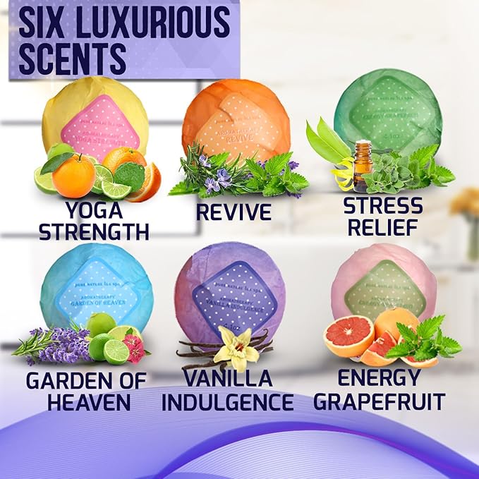 - SIX SCENTS: This bath bomb gift set features six different aromas to help you both relax and recharge; Featuring a blend of ylang ylang, lavender and marjoram to help reduce stress as well as uplifting combinations like citrus and bergamot for invigoration, Pure Nature Lux Spa’s bath products are the obvious choice for people who like to indulge in luxury