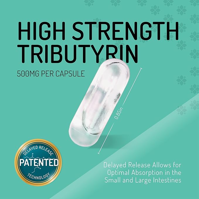 - Patented Delayed Release Capsules - Unlike other Butyrate supplements, Healus Complete Biotic utilizes an advanced patented delayed release capsule. These vegan capsules ensure optimal delivery and absorption in the small and large intestines. Produced in a Good Manufacturing Practice lab, the highest quality of product testing. Each capsule contains 500mg of Tributyrin.