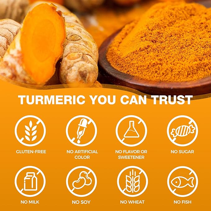 - PREMIUM INGREDIENTS: Our turmeric curcumin supplement contains no artificial color, flavor or sweetener, preservatives, sugar, starch, milk, lactose, soy, gluten, wheat, fish. Tested to ensure our high quality and purity standards