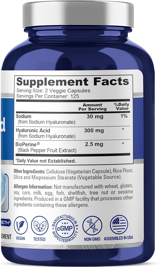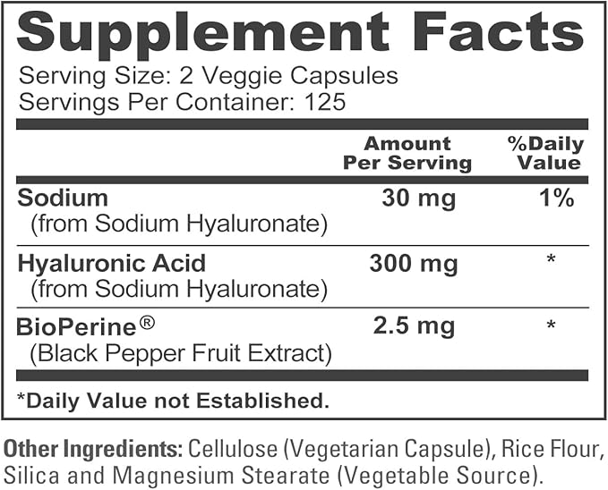 - High Absorption Hyaluronic Acid 300mg per serving Bioperine
