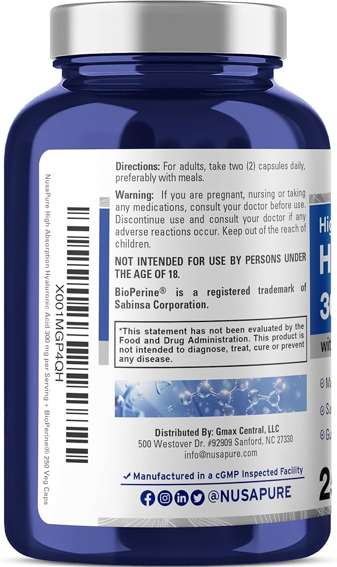 NusaPure Hyaluronic Acid 300mg 250 Veggie Capsules (Non-GMO, Vegan)
