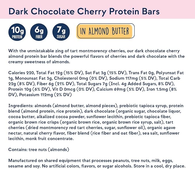 - A Nutritive Snack Bar that Packs a Flavorful Punch: Our Dark Chocolate Cherry Almond protein bar is a delicious and nutritious snack that combines the tartness of montmorency cherries, the richness of dark chocolate, and the creaminess of almonds. The tart cherries add a refreshing zing, while the dark chocolate provides a rich and decadent flavor.
