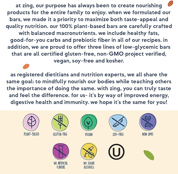 - We Set the Bar in Nutrition: Created by professional nutritionists, Zing Bars provide plant-based protein, good-for-you fats, substantial fiber, and energizing, low-glycemic carbs. The result is a nutritious bar that will power your whole day!