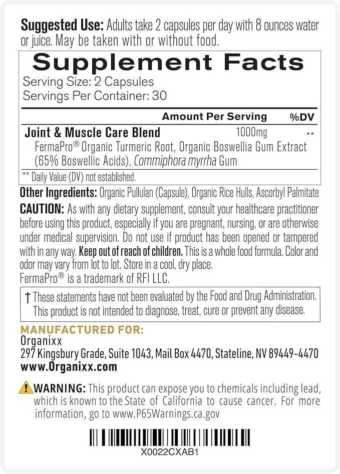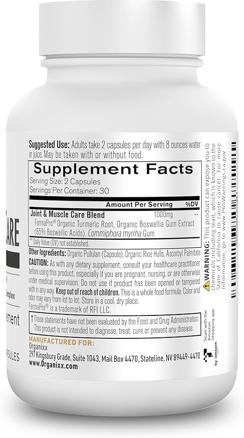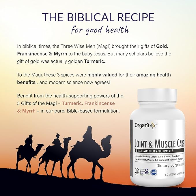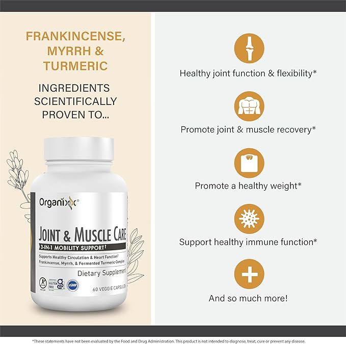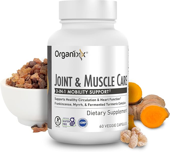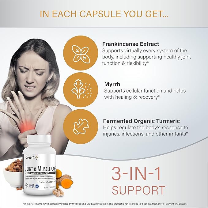 Organixx Joint & Muscle Care Organic Turmeric Supplement, 3-in-1 Frankincense, Turmeric and Myrrh Joint Health & Joint Support Supplement Body Care Capsules, Supports Swelling, Tension, 60 Capsules