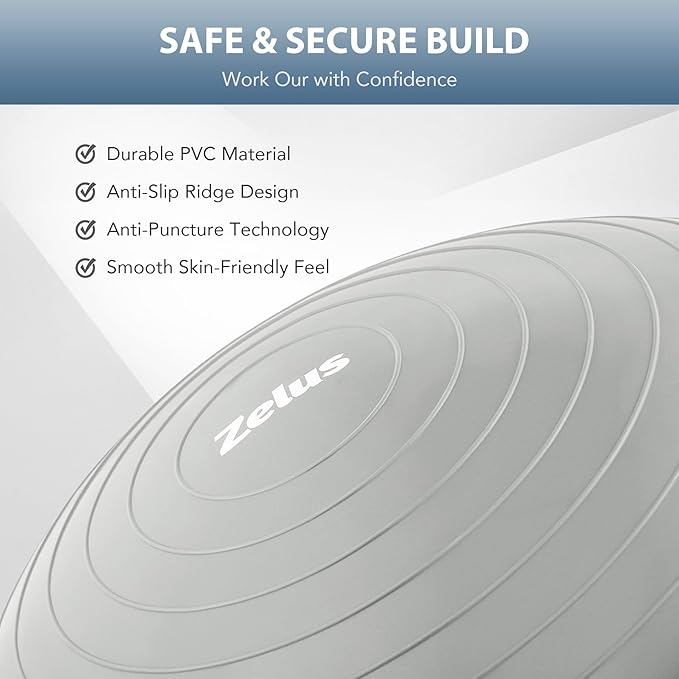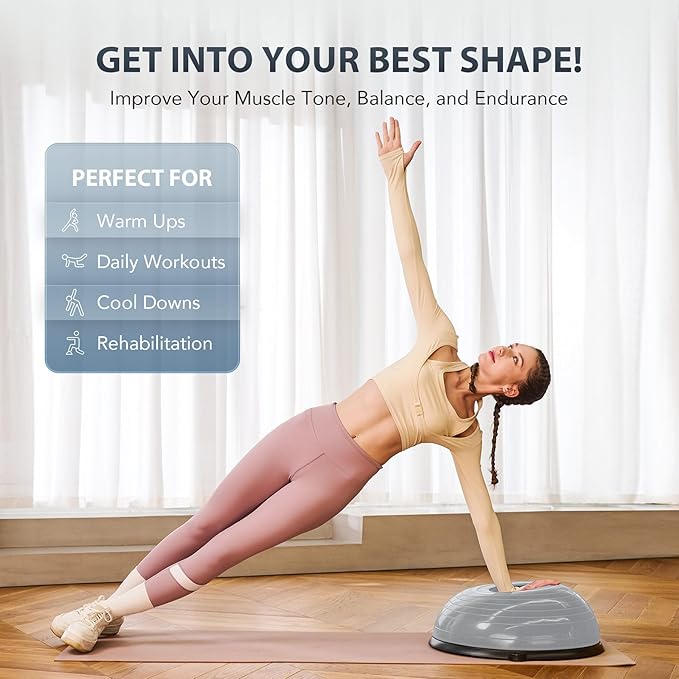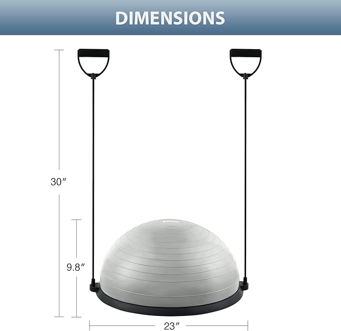- BALL PUMP INCLUDED: A complete combo, this half-dome stability ball comes with a complimentary foot pump that makes it easy to get fully inflated to 9.8” in under 5 minutes. The ball’s high-quality air valve prevents air leakage and extends service life