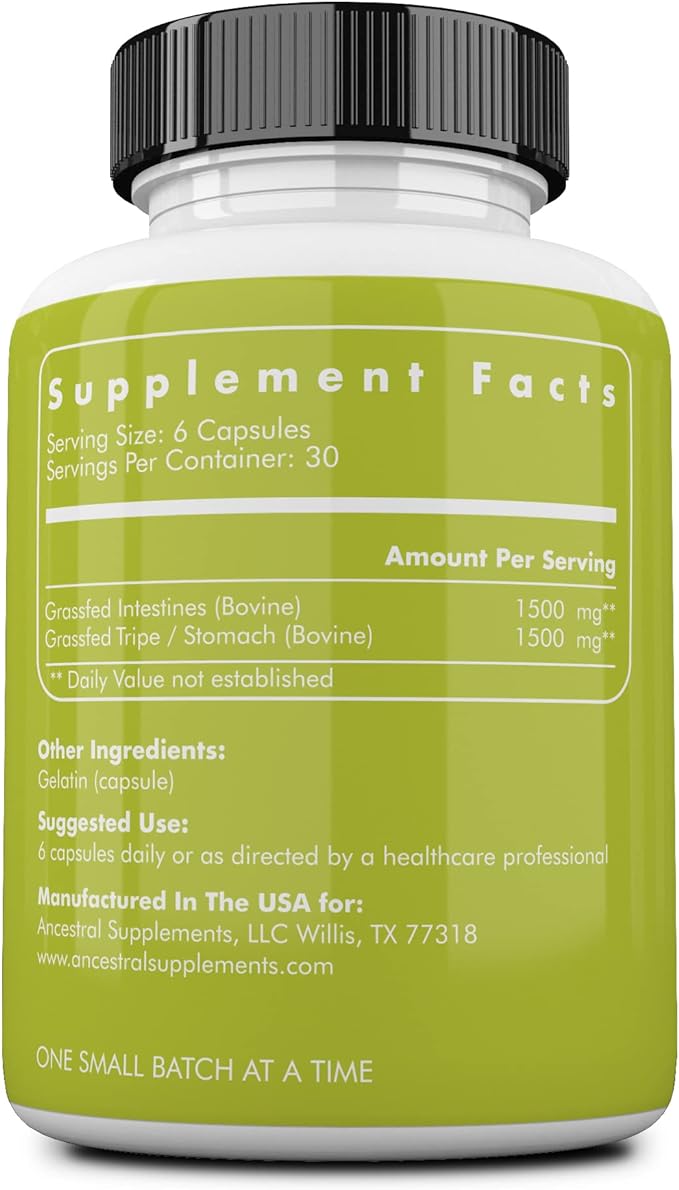 Ancestral Supplements Grass Fed Beef Intestines with Stomach (Tripe), 3000mg, Digestion Supplement Supports Acid Reflux and Gut, Intestine and Digestive Health, Non GMO, 180 Capsules