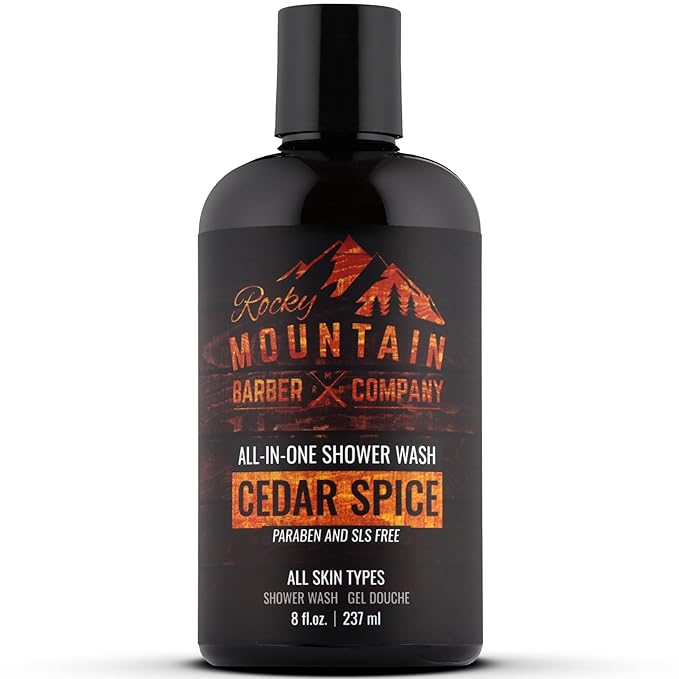 Rocky Mountain Barber Company Cedar Spice All-In-One Body Wash – Shampoo, Body Wash, Conditioner, Face Wash & Beard Wash with Essential Oils - 8 oz