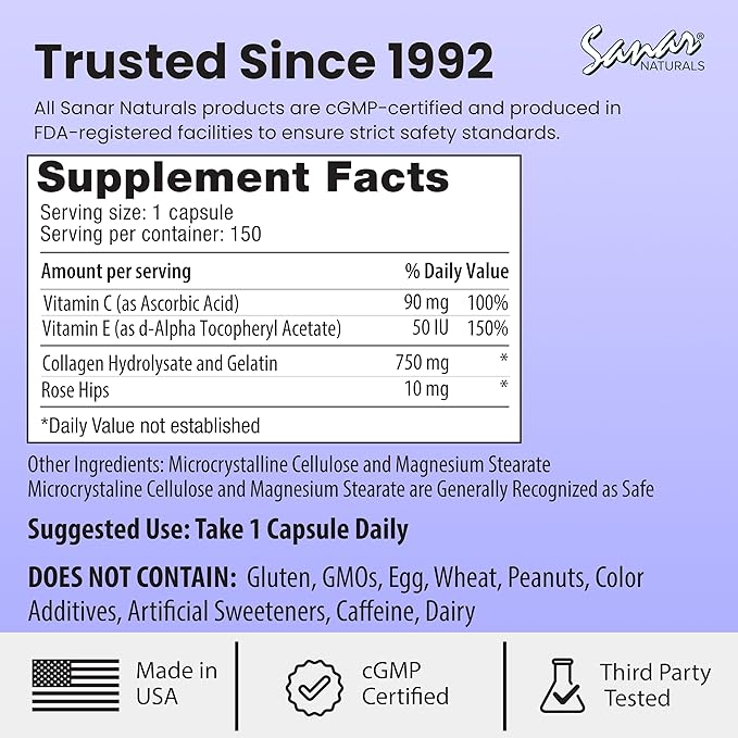 - TRUSTED SINCE 1992: Sanar Naturals believes in helping others live healthier lives since 1992 with high quality remedies that we take ourselves. Our Non-GMO, collagen pills are gluten-free, dairy-free and helps support your health, strength, and inner beauty. Manufactured in the USA.
