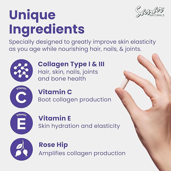 - COLLAGEN TYPE I & III: Our collagen peptides capsules naturally boost skin elasticity, improve skin hydration, hair growth, strong nails, and restores strong joints, bones, and tendons. Our collagen peptides pills are your go-to anti aging, hair skin and nails vitamins supplement.*