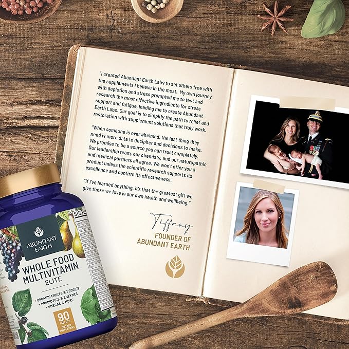 Abundant Earth Whole Food Multivitamin for Women, Daily Multi Vitamins Supplements for Men/Mens Multivitamins + B Complex, Probiotic Multi Enzyme, Omegas for Organic Energy, Mood, Digestion 90ct