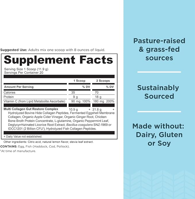 - EASY TO USE & PACKED WITH NUTRIENTS - One serving of Ancient Nutrition Multi Collagen Protein Gut Restore powder provides 9g of protein, 13.7g of gut restore collagen blend and 45 calories! Add a scoop to any smoothie, protein shake, tea, coffee or your favorite drink for a daily boost of collagen protein and gut support.