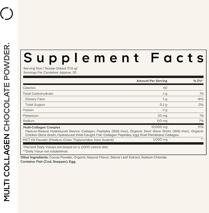 - A High-quality Blend of 5 Food Sources: This Multi Collagen Peptides Chocolate formula features five high-quality food sources for a more comprehensive formula. Codeage Multi Collagen Protein Chocolate Powder blend includes grass-fed and pasture-raised hydrolyzed bovine collagen peptides, organic beef bone broth, organic chicken bone broth, wild-caught fish collagen peptides, and eggshell collagens. This grass-fed collagen formula doesn't contain shellfish.