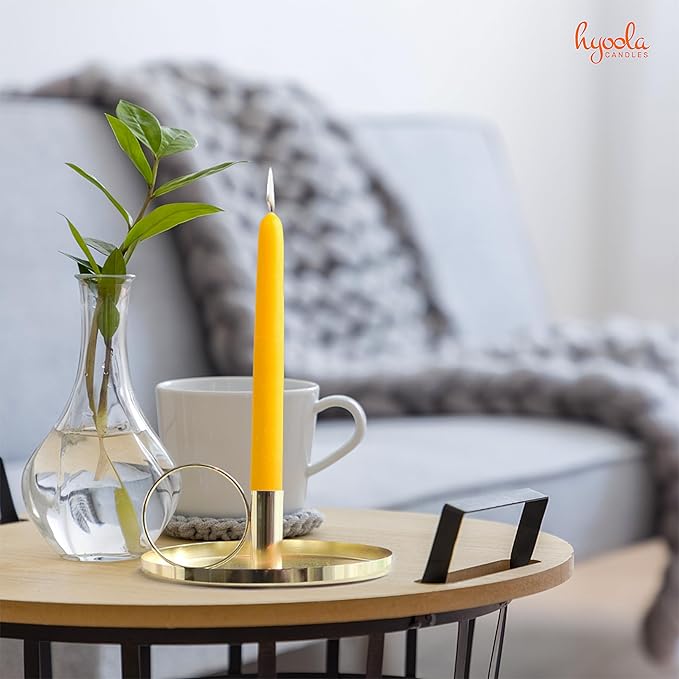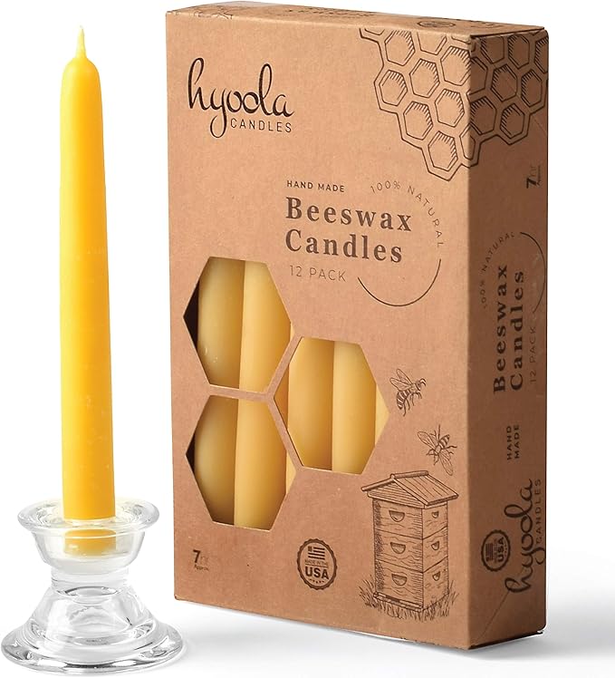 Hyoola 7 Inch Beeswax Taper Candles 12 Pack - Handmade, All Natural, 100% Pure Unscented Bee Wax Candle - Tall, Decorative, Golden Yellow - 7 Hour Burn Time