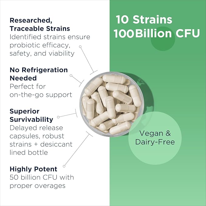- Broad-acting probiotics: Includes 100 billion CFU evidence-based digestive probiotics, with 10 of the most highly researched validated probiotic strains; designed to support gut health, healthy immune response, and normal bowel movements*