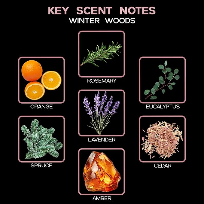 - WINTER WOODS – is a rustic holiday blend of Orange, Rosemary, Eucalyptus, Spruce, Amber, and Cedarwood; presented in the Infinity Diffuser with a slender neck and tan sheer ribbon accent for a refined look, complete with natural eucalyptus for a cozy seasonal touch; ideal for warm, wood-toned holiday interiors.