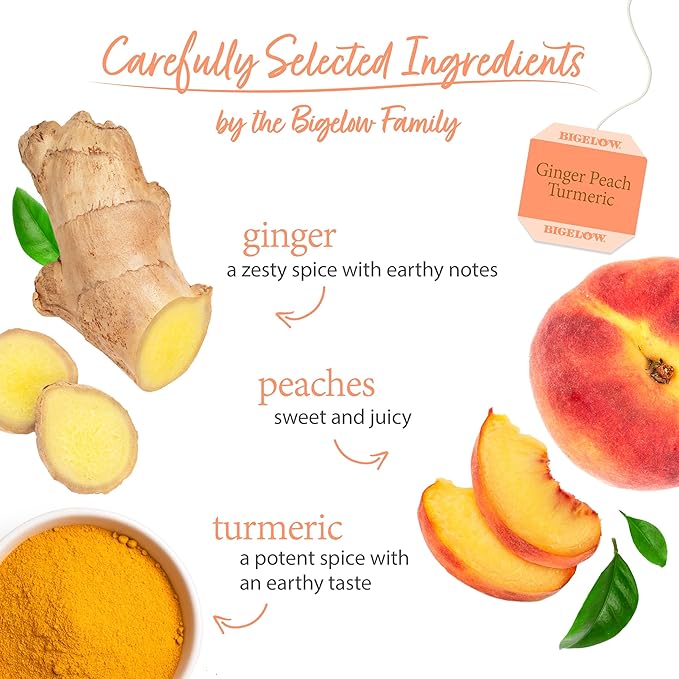 - Bigelow Ginger Peach Turmeric Herbal Tea, Caffeine Free, Gluten Free, Non GMO, 0.98 Ounces (Pack Of 6)