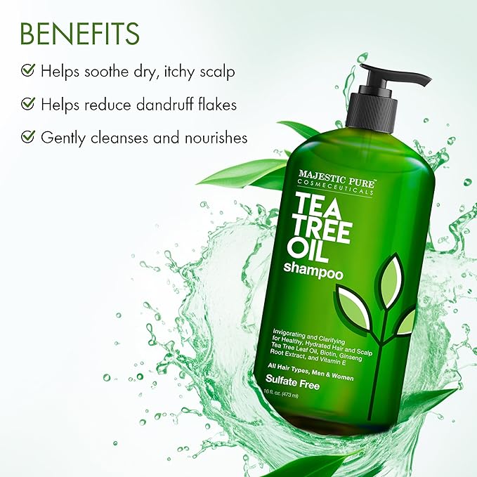 - Majestic Pure Tea Tree Oil Shampoo; contains pure tea tree oil; sulfate free; paraben free; made in USA