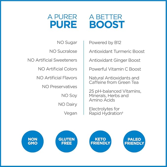 - POWERED BY B12 & GREEN TEA: 100 mg of natural green tea caffeine combined with B12 for a sustained, powerful energy boost.* Skip the jitters and crashes—Pureboost is designed to keep you going and feeling good.