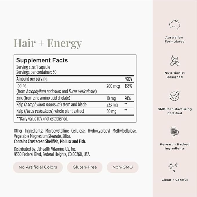 JSHealth Vitamins Hair and Energy Formula - Hair & Scalp Support Supplement with Iodine and Zinc - 30 Capsules