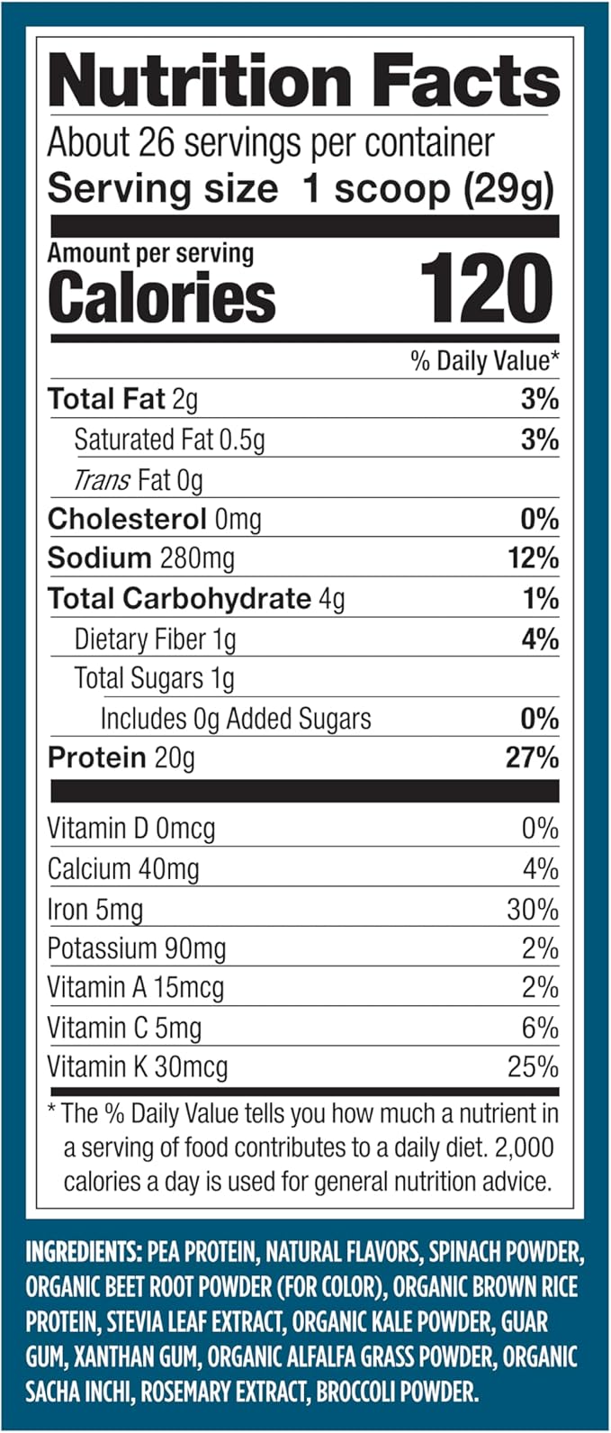 - 20G PROTEIN: Made with 20 grams of plant-based protein and real green vegetable ingredients including organic spinach kale, organic alfalfa and broccoli, for an on-the-go protein powder for women and men.
