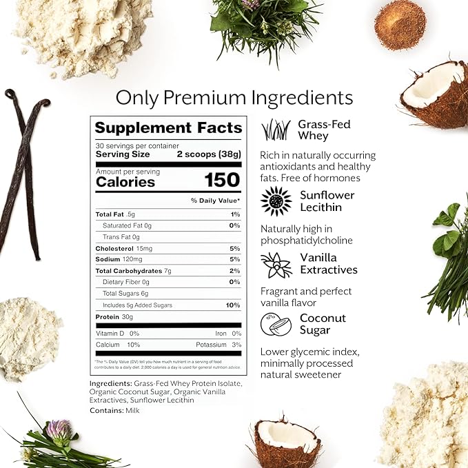 - Whole Food-Based Ingredients: Made of grass-fed whey (rich in naturally occurring antioxidants and healthy fats), sunflower lecithin (naturally high in phosphatidylcholine), vanilla extractives, and coconut sugar (lower glycemic index, minimally processed natural sweetener). That’s it.