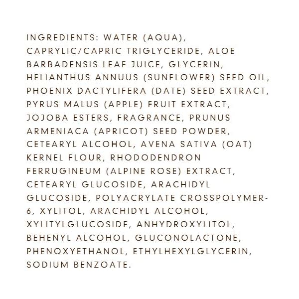 - Active Ingredients : Oat, Jojoba Oil, Apple, Dates, Aloe Vera, Vitamin E, Vitamin C ,Sunflower Seed Oil, Alpine Rose Stem Cell Oat, Jojoba Oil, Apple, Dates, Aloe Vera, Vitamin E, Vitamin C ,Sunflower Seed Oil, Alpine Rose Stem Cell