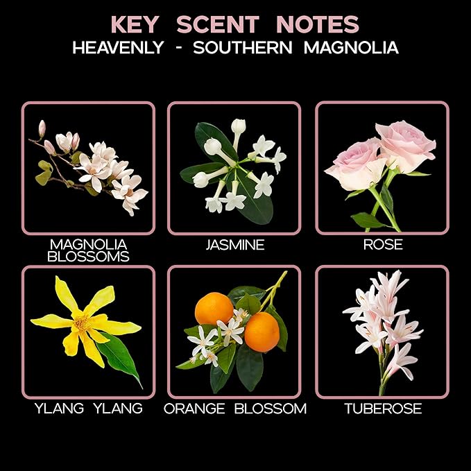 - HEAVENLY SOUTHERN MAGNOLIA – a delicate floral symphony of Magnolia Blossoms, Jasmine, Rose, Ylang Ylang, Orange Blossom, and Tuberose; displayed in our Classic Elegance Diffuser with a white ribbon accent atop its slender neck, accented with real hydrangea blooms; ideal for white, ivory, and soft floral interiors.
