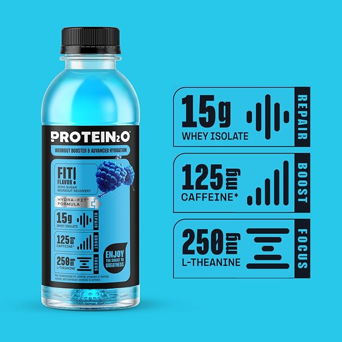 Protein2o 15g Whey Protein Isolate Hydration Drink Plus Energy & Focus, 350mg of Electrolytes, 125mg of Caffeine, Sugar Free, Blue Raspberry, 16.9 oz Bottle (Pack of 12)