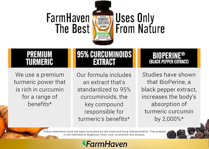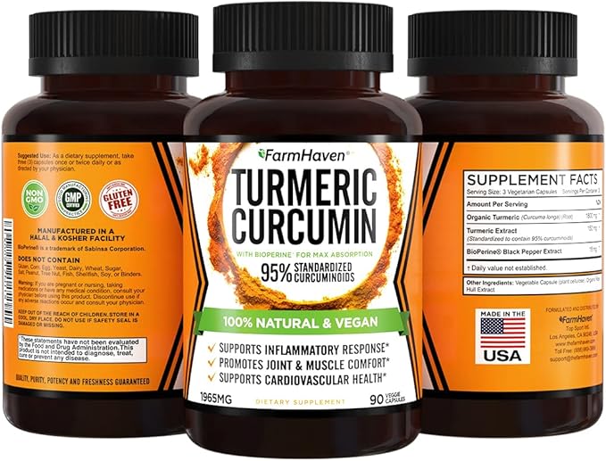 - POWERFUL 1965MG TURMERIC BLEND: While other turmeric products may use mediocre and ineffective ingredients, FarmHaven's Turmeric Curcumin supplement lovingly delivers a blend of pure turmeric curcumin powder and 95% standardized curcuminoids turmeric extract. Each serving packs 1, 965mg (one of the highest totals) of potent turmeric goodness optimized to help you live a healthy and active lifestyle!*