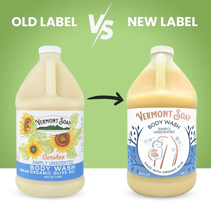 VERMONT SOAP Body Wash, Natural Body Wash with Shea Butter, Mild Gel Body Wash for Moisturizing and Soothing Skin, Fragrance Free Body Wash for Women & Men (Simply Unscented, 64oz)