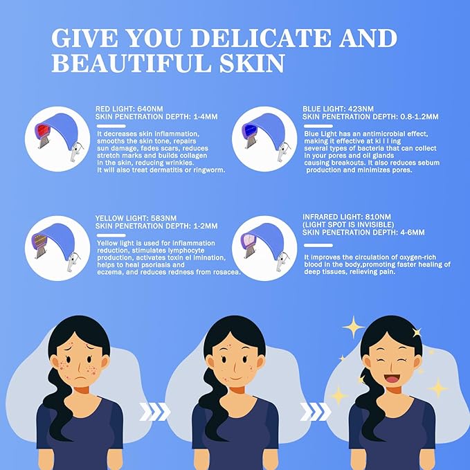 - 4 in 1 LED Mask -Red Light, Yellow Light, Blue Light,Infrared,Choosing specific colour for your need.Any combination of red and yellow three basic colors generate seven colors.