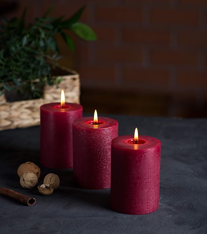 Set of 3 Pillar Candles 3" x 4" Unscented Handpoured Weddings, Home Decoration, Restaurants, Spa, Church Smokeless Cotton Wick - Burgundy