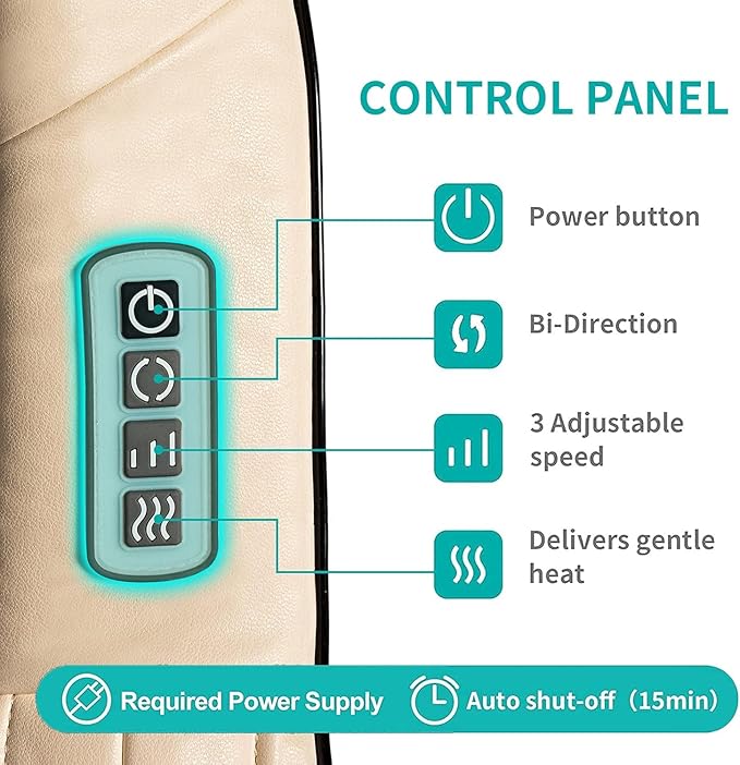 - Easy and Safe to Use. Built-in infrared advanced soothing heat function, the massager will improve your blood circulation, and it is settled within 15 minutes overheating auto-shut off protection. (Can be turned off manually)