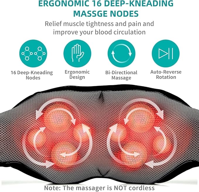 - 16 Powerful Deep-Shiatsu Kneading Massage Nodes. Our neck massager help you better with alleviate muscle soreness, ease neck stiffness, eliminate cervical fatigue, and relax yourself after a long day work