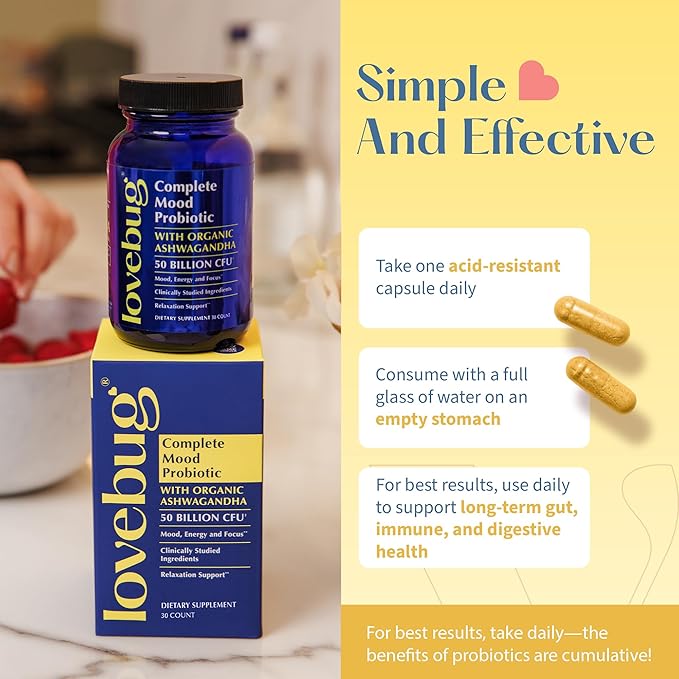 - Emotional Balance Made Simple – LoveBug mood probiotics for women are formulated to foster a healthy gut-brain connection by supporting a balanced microbiome*, helping you to feel happy and manage everyday stress*