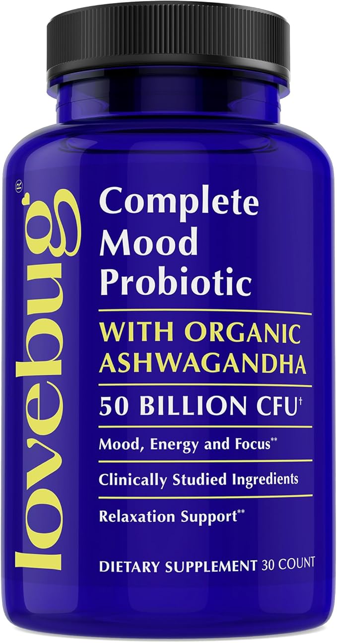 LoveBug Complete Mood Probiotics for Women - 50 Billion CFU, 10 Clinically Studied Strains, Lactobacillus Bifidobacterium Probiotic with Ashwagandha Digestive Health, Mood Support Supplement, 30 Count