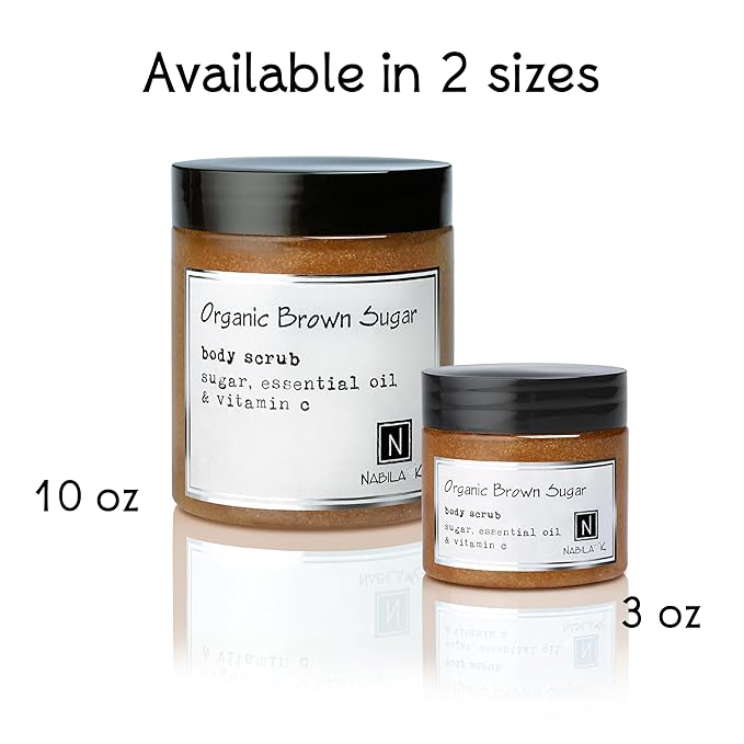 Organic Brown Sugar Body Scrub Made in USA with Essential Oil and Vitamin C by Nabila K - Exfoliate and Moisturize for Smooth Skin - Luxury for Women & Men, 10 oz