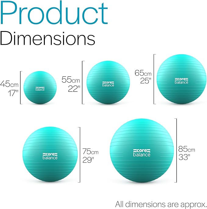 - RANGE OF SIZES FOR A PERFECT WORKOUT: Core Balance Gym Balls come in a choice of sizes to suit your height and workout in comfort. Check out our size guide (image 5) to determine whether you need a 55cm, 65cm, 75cm, or 85cm ball. As an added bonus, each gym ball includes a pump and tape measure to easily inflate to the correct capacity.