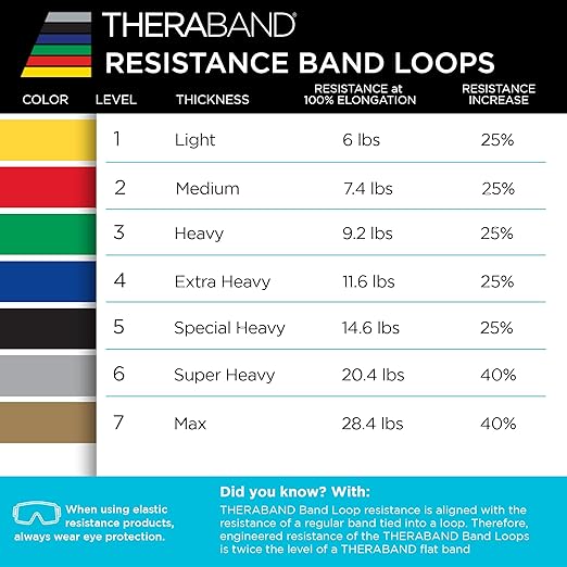 - COLOR-CODED RESISTANCE FOR PROGRESSION: The Band Loop Set includes Level 1 Yellow (Light – 6 lbs), Level 2 Red (Medium – 7.4 lbs), Level 3 Green (Heavy – 9.2 lbs), and Level 4 Blue (Extra Heavy – 11.6 lbs), each increasing by 25% of resistance from the previous level