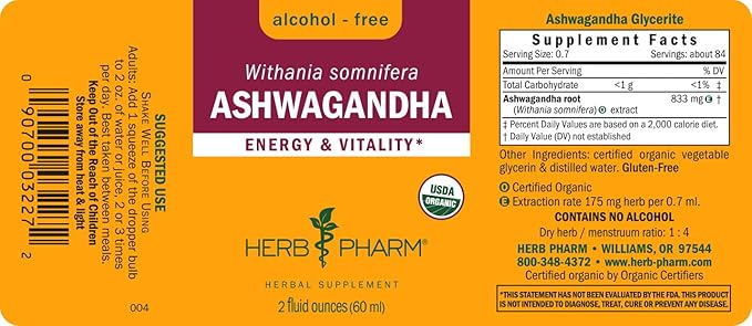 Herb Pharm Certified Organic Ashwagandha Extract Drops for Traditional Support for Energy and Vitality, Alcohol-Free Glycerite, 2 Oz