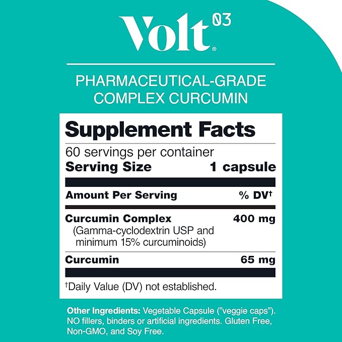 - Boosts Joint and Immune Health: Curcumin, an active ingredient found in turmeric, has been shown to help improve brain function and immune health. This curcumin turmeric capsule also promotes joint function, which helps to alleviate movement discomfort. Volt03 works better than regular curcumin and turmeric extracts because each 400-mg capsule contains more than 65 mg of curcumin.
