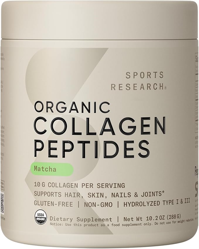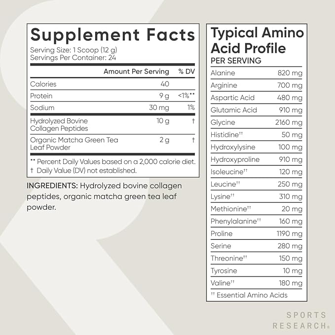 - A POWER COMBO: Meet your new morning ritual! Sports Research Collagen Peptides with Matcha combines our best-selling Collagen with ceremonial-grade Organic Japanese Matcha Green Tea Leaf in an easy-to-mix powder with no sugar or artificial flavors and only 40 calories per scoop.
