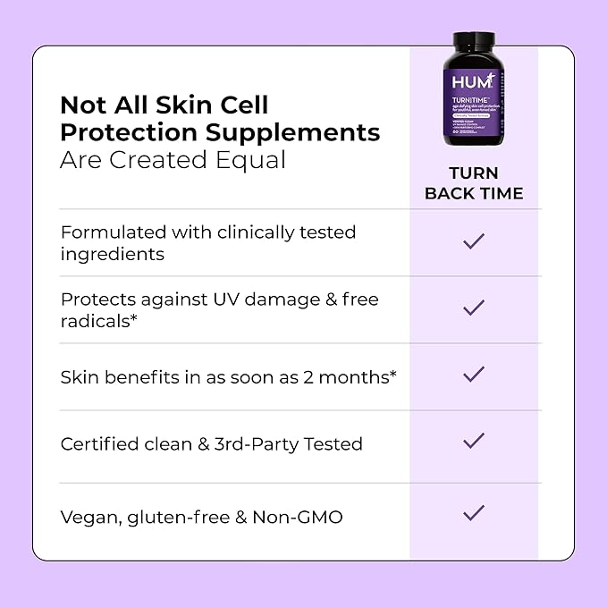 - CLEAN AND CLINICALLY STUDIED: HUM products are Clean Label Project Certified, non-GMO, and carefully formulated to meet consistent standards for safety and quality. Free from artificial flavors, sweeteners, and colors, you can trust the thoughtful design of our Turn Back Time supplement.*