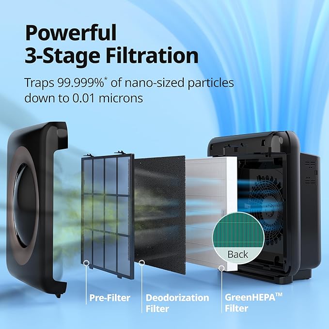 - [HyperCaptive Filtration System] Dynamic combination of a washable pre-filter, active carbon filter, and True HEPA Filter effectively reduces 99.999% of 0.01-micron particles in the air, including pollen, pollutants, and other allergens. It also reduces 99% of volatile organic compounds and odor.