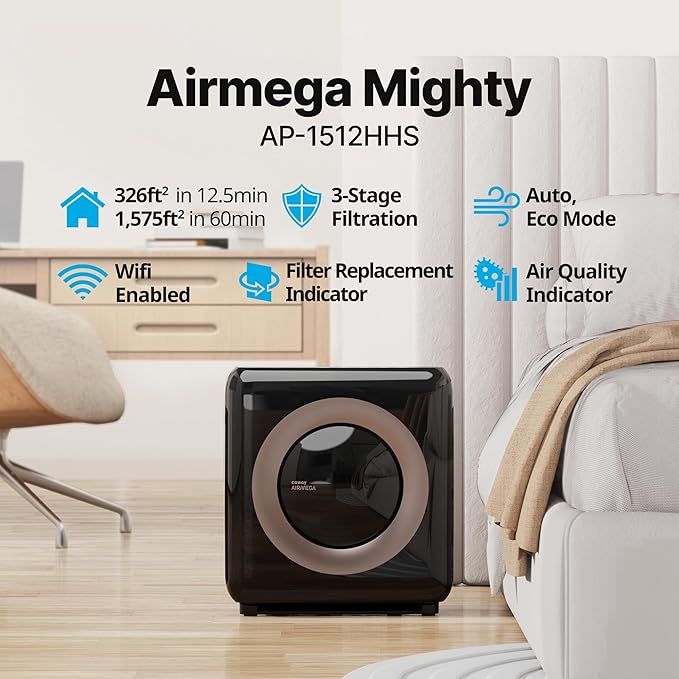 - [APP and Voice Control] Coway Airmega AP-1512HHS is Wi-Fi enabled with Mobile IoCare App. Monitor your indoor and outdoor air quality in real-time, create easy reports to stay informed. Control from your device, including turning off/on, changing modes or fan speed, creating a schedule, and using a timer (1, 4, or 8 hours). Monitor your filter usage and order replacements with the touch of a button. Also, works with Google Home and Alexa.