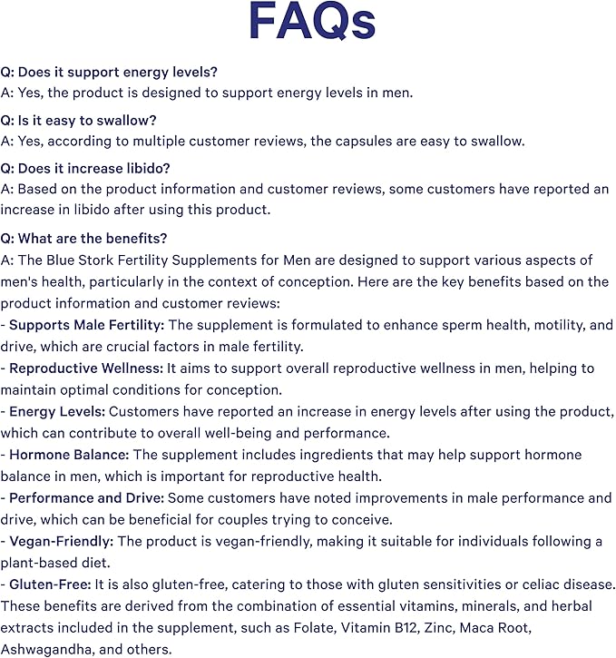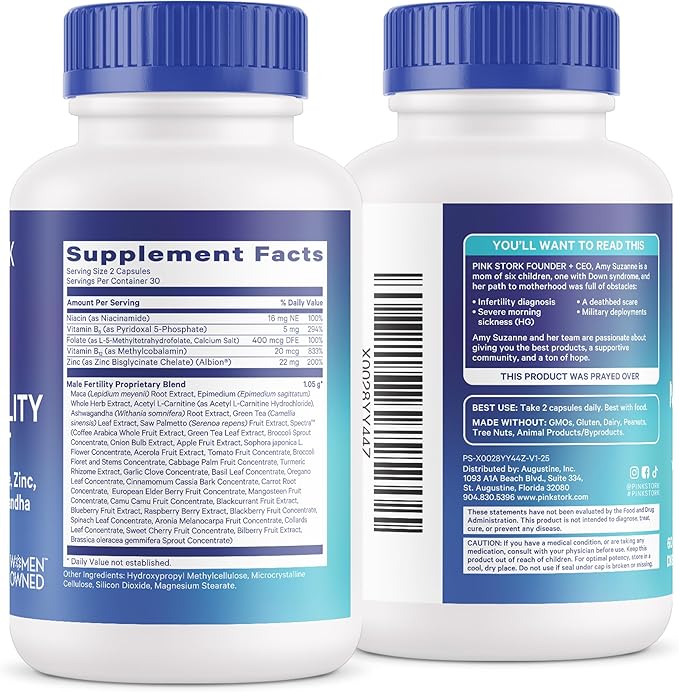 - Blue Stork Fertility Supplement features Folate (natural folic acid), Vitamin B, Vitamin B12, Zinc, Maca Root, Horny Goat Weed, Ashwagandha, Turmeric, Saw Palmetto, and vegetable and fruit extracts exclusively designed to support men's health and modern fertility needs.