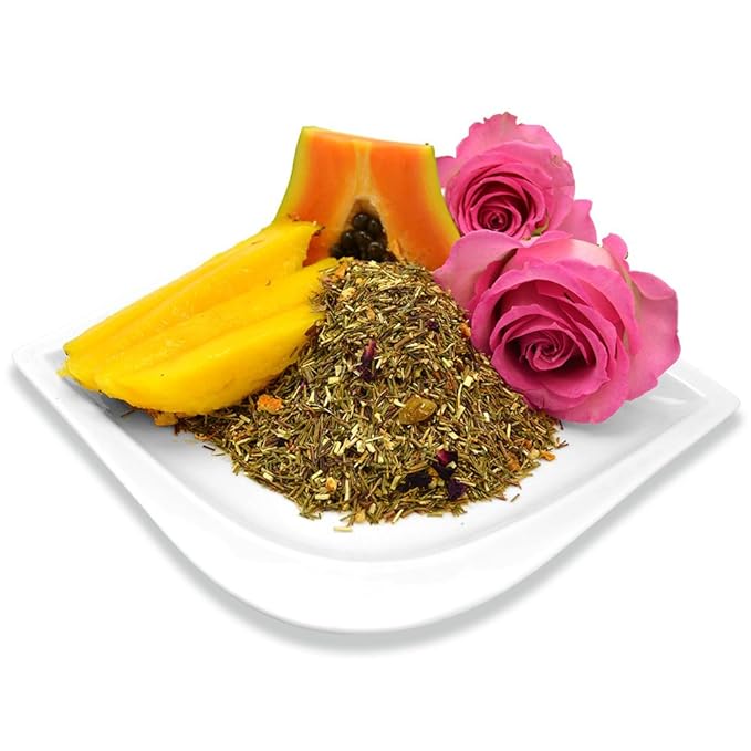 - INGREDIENTS - organic green rooibos, organic mango pieces, organic papaya pieces, organic orange peel, organic rose petals, natural mango, passionfruit and papaya flavors
