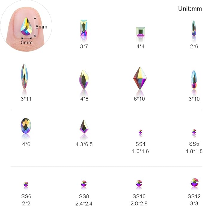 - 【Widely Used Crystal Rhinestones】Our nail stones set is available popular iridescent crystal AB color. It works very well for your nail art, DIY craft decorating, clothes, shoes and so on. Is a very personal and fashionable rhinestones for crafts.