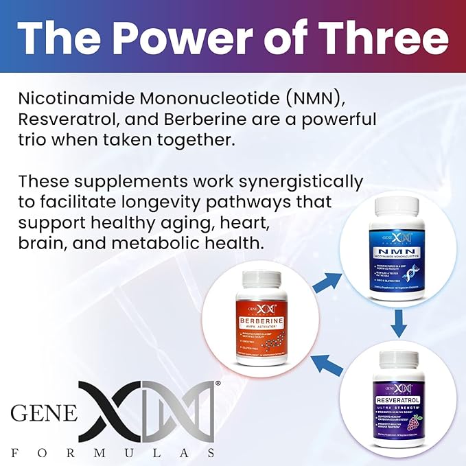 - POWER OF 3 - The ultimate healthy aging trio! NMN, Resveratrol, and Berberine from Genex Formulas work together synergistically to facilitate longevity pathways that support heart, brain, and metabolic health.