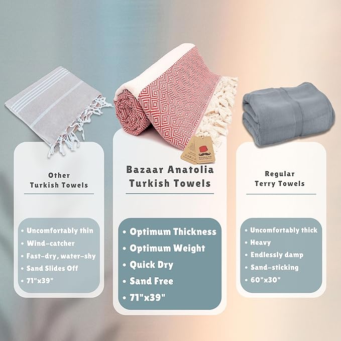 - Versatile: There are many ways to use Turkish Beach Towel. You can use the turkish towel as a scarf on the outside, shawl on the terminal, travel blanket on an airplane, oversized beach towel when you get off the plane and go to the beach. Quite useful as a travel beach towel. Or you can use as a bathroom towels, yoga mat towel, pool towel or a throw blanket in your house.